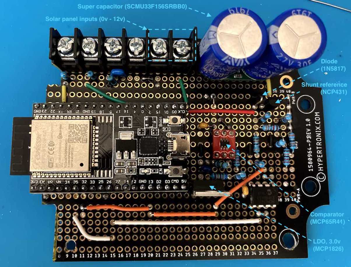 The ESP32 is a tiny, powerful, and inexpensive micro controller from Espressif. It has Wi-Fi and Bluetooth built in which makes it great for IoT projects. In this post I will talk about running an ESP32 on solar power. This post is not specific per-se to ESP32s and could be applied to any small 3v device.